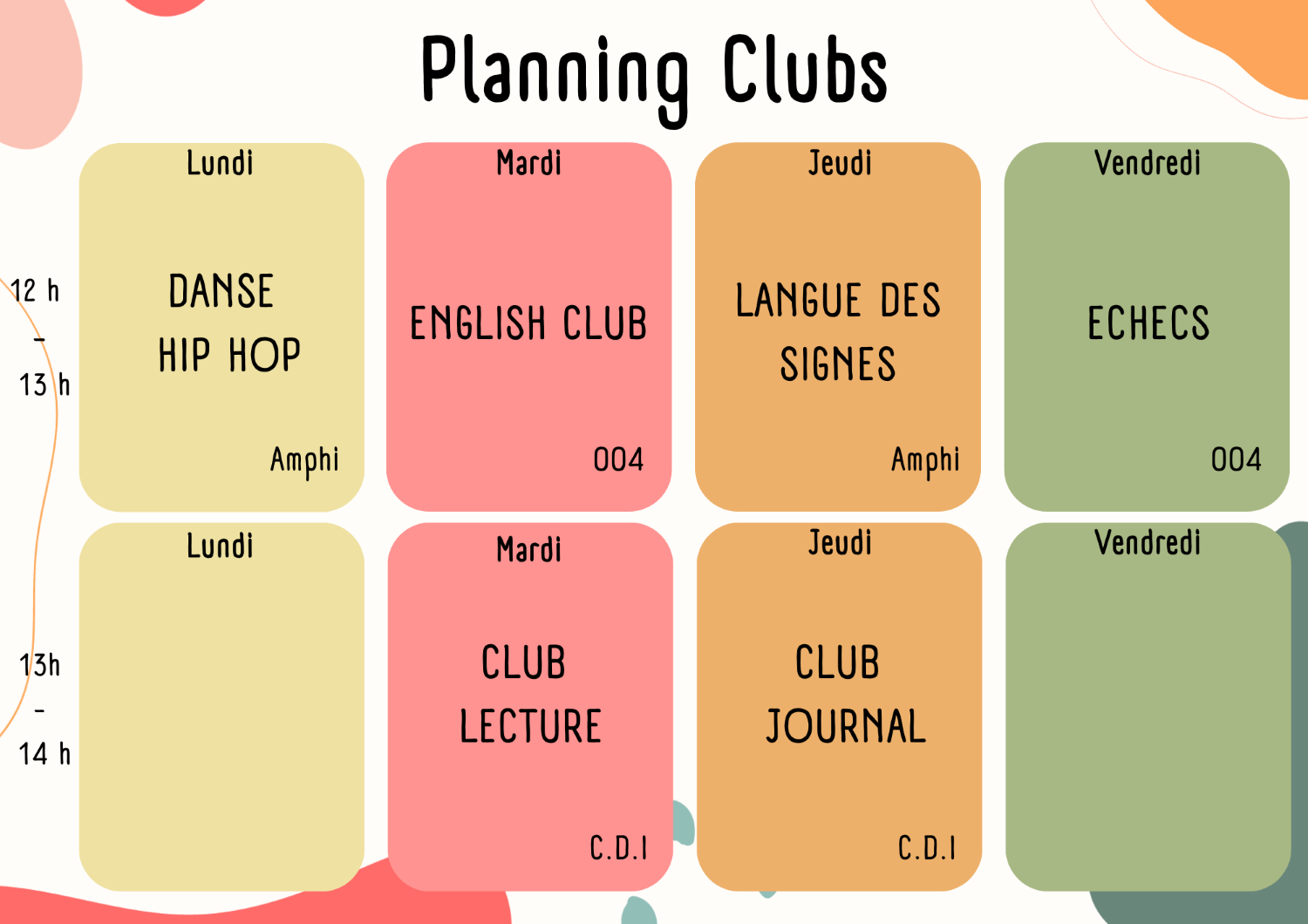 Clubs et planning pour l’année 2024-25 Tuesday 5 November 2024 (actualisé le 17 April 2025) CLUB DANSE HIP-HOP ; ENGLISH CLUB ; CLUB LLANGUE DES SIGNES; CLUB ECHECS; CLUB LECTURE; CLUB JOURNAL.